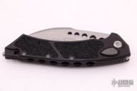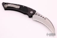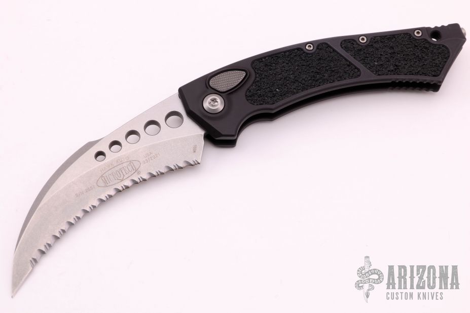 This Hawk Auto by Microtech Knives features a stonewashed fully serrated hawkbill blade. The handle has a black aluminum frame with blasted stainless steel hardware and tip up clip. Dated 03/2021 and s/n 2557. Comes with original box and papers. New condition.