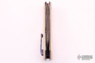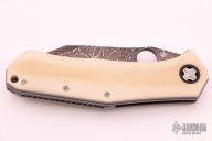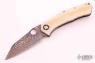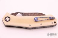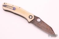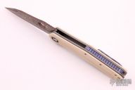 This Mechanic-B Linerlock from Jim Burke features a copperwash Nichols Carbon Damascus clip point blade with swedge, thumbhole and notched thumb ramp. The handle is comprised of antique Westinghouse scales over blasted titanium liners. Mokuti clip and sculpted backspacer. Comes with leather slip and COA, made 2021. New from maker.