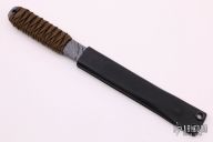 In 1988, he began making specialized knives for use by the military. This turned out to be fortunate turn of events, both for Mick and for the knife using world at large. Mick’s approach was to not get burdened by the weight of past designs. He started with a tabula rasa, a clean slate, informed only by his own experiences and knowledge of what a soldier needed in a knife. The knives he made didn’t look like the hunter-inspired knives seen in most PXs; instead they were almost brutish in their functionality: beefy, solid, and with unbreakable ¼” stock full tangs. These knives were the first indication of his innovative approach: in addition to their utilitarian design, the knives carried a subdued finish and subdued sheaths. No one carrying a Strider knife was going to be spotted because of sunlight glinting off of polished steel or a glossy leather sheath. Soldiers, policemen, and other men going into harm’s way couldn’t buy them fast enough. Mick sampled some good ideas, but made them great. For instance, he was not the first to wrap a knife handle with paracord, but he was the first to do it in a way that was tough enough for sustained infantry use. His knife line grew over the following years to include different varieties of fixed blades, all distinctive and many with specialized uses. But constant in all of them was a disregard for convention, and a desire to try new ideas. An example of this was the Ajax – it featured a very wide blade surface clearly designed to inflict damage. It drew on the weapons carried by Roman legionnaires, yet was modern and usable in the 21stCentury battlefield. Mick also worked on his technical skills, always striving to become better at the physical craft. At the 2002 Blade Show, a group of the best tactical knifemakers in the country decided to compete with each other to produce the most innovative and interesting fixed “battle blade” at the show. Mick’s entry, an incredible integral knife made out of ½” titanium stock with a zippered composite blade, gorgeous handles, and integral guard was the unanimous winner, and effectively retired the competition.