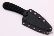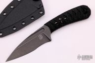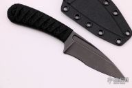 This SIN by Bastinelli Knives features a black recurve blade with notched thumbrest and fullers, .136" blade stock and 1.15" blade depth, full tang construction. The handle has a custom black cord wrap over a bronzed menuki. Comes with kydex sheath and zippered case. New from maker!