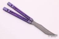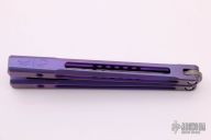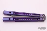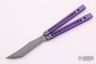 This Monarch balisong by JK Design features a milled, stonewashed, upswept recurve clip point bade. The handles are comprised of anodized and stonewashed titanium with milled long speed channel, bronze phosphorus washers and steel bushings. Marked JK|JH on the handle. Comes with Zipper case, makers card, and stickers. New from Maker.