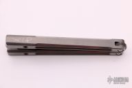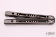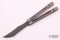 This Monarch balisong by JK Design features a milled, acid washed, upswept recurve clip point bade. The handles are comprised of two-tone stonewashed titanium with milled full channel, bronze phosphorus washers and steel bushings. Marked JK|JH on the handle. Comes with Zipper case, makers card, and stickers. New from Maker.