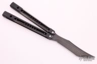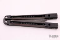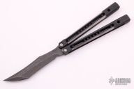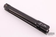 This Monarch balisong by JK Design features a milled, acid washed, upswept recurve clip point bade. The handles are comprised of two-tone blackened titanium with milled full channel, bronze phosphorus washers and steel bushings. Marked JK|JH on the handle. Comes with Zipper case, makers card, and stickers. New from Maker.
