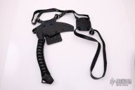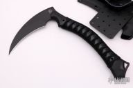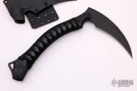 The ReaperTAC from Bastinelli Creations is one cool tool. It's a tactical version of a scythe, an old school tool for reaping crops that has long since been replaced by heavy machinery throughout much of the world. This variation is like a tomahawk in its tactical usage however it incorporates none of its utility functionality. The ReaperTAC measures 9.45" overall with a 6.7" Bohler N690Co stainless steel blade. The recurved shape allows this blade to rip and tear like an elongated talon and the design tapers toward the tip to allow ample penetration power from such a unique tool. The ergonomic handle is made from contoured black G10 allowing a sure grip at the base or top of the handle. The ReaperTAC includes a kydex and leather shoulder sheath. New from maker.