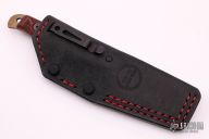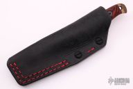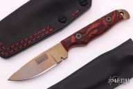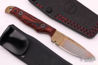 This Handyman by Dawson Knives features an Arizona Copper finished blade with notched thumbrest, .121" blade stock and .935" blade depth, full tang construction. The handle has red/black G-10 scales with red liners. Comes with a kydex sheath and a custom Black leather sheath, original box and papers. Excellent condition. #029
