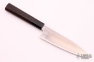 This kitchen knife by Murray Carter features a laminated stainless steel blade with a satin finish and a hidden tang construction.  .90" Blade Stock.  1.50" Blade Depth.  The handle features buffalo horn bolster and wood grip.  Includes the original box.  This knife is razor sharp! Excellent Condition.