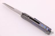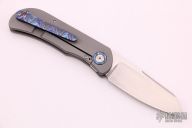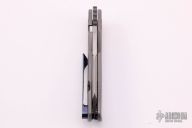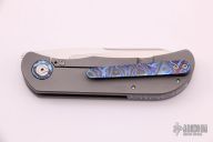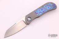 This EXK CFL from Burger Knives features a hand rub satin finished sheepsfoot blade with notched thumbrest and front flipper. The handle is comprised of a bead blasted and milled titanium frame with black timascus inlay, pivot collars, tip up clip and backspacer. Includes a zippered case and COA dated October 2021. Excellent Condition.