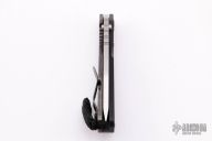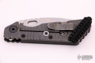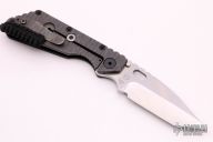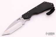 This SMF from Strider Knives features a stonewashed tanto blade and textured black G10 and flamed titanium handle and matching tip up titanium clip. Notches on thumbrest, rear of handle, and lockup. Includes Hinderer "Lock Bar Stabilizer" for maximum reverse lock retention. Comes with a zippered case. Has scuffs and scratches, has been resharpened, otherwise good condition.