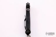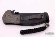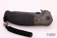This Po-Boy Roadhouse has a black blade with a thumbdisc and wave feature. #1505. The handle has dovetailed Damascus bolsters and black canvas micarta scales, thick black titanium liners and stainless steel tip up clip. Nice detent, lockup and blade seating. Excellent condition. Comes with original box, papers and original scales and liners.