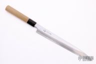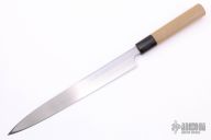 The Yanagiba by Shigefusa is a long narrow kitchen knife traditionally used for slicing sashimi. The blade only has a bevel on one side and is hollow ground on the other side.  .129" Blade Stock.  1.14" Blade Depth.  The handle is composed of buffalo horn and Ho wood.  Includes the original box.  Excellent Condition.