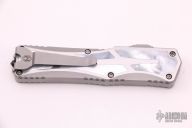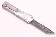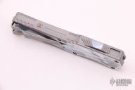 This Colossus by Heretic Knives features a Vegas Forge Damascus tanto blade with fullers. The handle has a two-tone stainless steel frame with mirror polished flats and blasted finish otherwise, beautiful seamless mother of pearl inlays, stainless steel thumb slide with mother of pearl inlay, stainless steel tip down clip. Comes with original box, zippered case and COA dated 11/21 and s/n 012. New from maker at the 2021 NYCKS.
