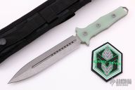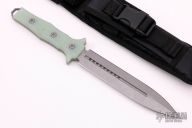 This Nephilim by Heretic Knives features a double edged and Battle-worn blade, .201" blade stock and 1.167" blade depth, full tang construction. The handle has jade G-10 scales with battleworn hardware, lanyard hole at the butt. Comes with a black nylon sheath. New from maker at the 2021 NYCKS. Comes with original box.