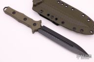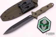 This Nephilim by Heretic Knives features a double edged and Battleworn Black blade, .201" blade stock and 1.167" blade depth, full tang construction. The handle has green G-10 scales with battleworn black hardware, lanyard hole at the butt. Comes with a kydex sheath. New from maker at the 2021 NYCKS. Comes with original box.