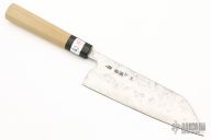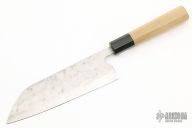This custom santoku by Teruyasu Fujiwara features a hand forged blade with hidden tang construction, .115" Blade Stock and 2.01" Blade Depth. The handle features a buffalo horn bolster and a Ho wood grip. Includes the original box.