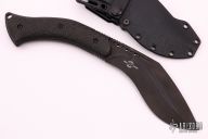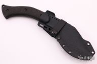 The PDK has been designed to be a smaller fighter/utility kukri that can easily be carried on a daily basis. The intent behind the PDK design is to have at hand all the devastating power of a kukri only in a smaller, easier to carry package. A kukri that can be used as a defensive knife or for utility tasks. The blade is double ground to ease penetration and the top edge may be sharpened. The PDK has sure but comfortable top and bottom jimping. The PDK blade is made of American CPM S35VN and is PVD coated. Features full tang construction with exposed and radiused tang edges. This is done to reduce rolling in the hand and add impact strength to the handle. The scales are strongly contoured to give a sure and comfortable grip. The PDK handle is comfortable in forward and reverse grip and is intended to be used both in a choked up or rear hold position. The pommel end of the PDK features an exposed lanyard hole. The sheath is molded of .080 thick Boltaron and features a custom molded, removable belt loop. The sheath has a break front design for faster drawing and re sheathing. Sheath features ample tiedown points/slots for alternative mounting solutions. Sheath has a molded drain feature. The PDK was designed and built in the USA, built from 100% USA sourced materials.