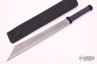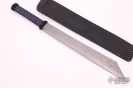 This Asian Influenced Chopper features a hand rub satin finished blade with hamon, .177" blade stock and 1.889" blade depth, hidden tang construction with cord wrapped handle. Comes with a kydex sheath. Has some light scratches, otherwise excellent condition. It's pretty nice, too bad who ever made it didn't mark it...
