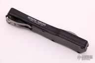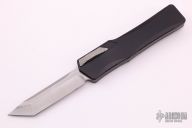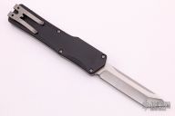 This Cleric OTF by Heretic Knives features a stonewashed tanto blade. The handle has a black tumbled aluminum frame with a stepped and bead blasted stainless steel thumbslide and tumbled stainless steel tip down clip. S/N 00100. Excellent condition. Comes with original box and papers.
