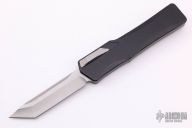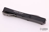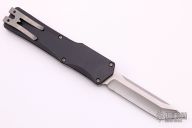 This Cleric OTF by Heretic Knives features a stonewashed tanto blade. The handle has a black tumbled aluminum frame with a stepped and bead blasted stainless steel thumbslide and tumbled stainless steel tip down clip. S/N 00100. Excellent condition. Comes with original box and papers.