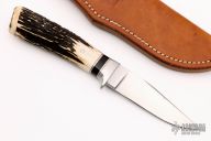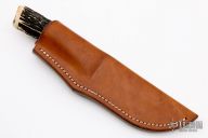 This knife by John Young features a satin finished drop point blade with a false top edge and a hidden tang construction.  The handle features a steel guard, red/black spacers and a stag grip/butt cap.  Includes a brown leather sheath and a padded zippered case.  Light scratches are visible on the blade and handle otherwise the knife is in excellent condition.