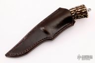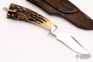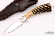 This knife by Jim Siska features a hand rub satin finished blade with fileworked thumbrest, .186" blade stock and .850" blade depth, hidden tang construction. The handle has a steel guard and butt with lanyard hole and stag grip. Comes with a padded zippered case and a brown leather sheath dated '08.  Light sheathing marks are visible on the blade otherwise the knife is in Excellent Condition.