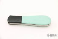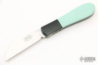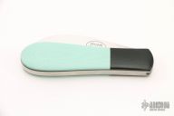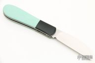 This Slipjoint by Stone Handmade features a hand rub satin finished sheepsfoot blade. The handle has black G-10 bolsters and liners with teal G-10 covers, stainless steel liners and spring. Has half-stop, flush in all positions. Comes with a leather slip sheath. New from maker.