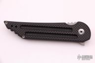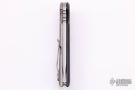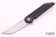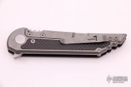 This UHEP frame-lock flipper by Jake Hoback has a stonewashed upswept/tanto blade, notched thumbrest and flipper. CBP caged bearing pivot. Handle is carbon fiber and titanium with carbon fiber inlay on the lockside, stonewashed titanium tip up clip and backspacer, clip is reversible left or right. This knife has an adjustable detent. Nice detent, lockup, and blade seating, and flips well. Knife is in excellent condition and shows no signs of use. Has some scuffs and scratches, good condition.