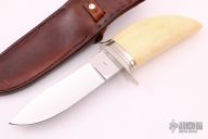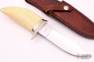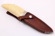 This knife by "King" (please let us know if you know which King this is) features a mirror polished blade with .186" blade stock and 1.480" blade depth, hidden tang construction. The handle has a nickel silver guard with brass spacers and a whale tooth grip. Comes with a hand tooled brown leather sheath. "1978" on blade, so i'm guessing it was made in 1978. Excellent condition.