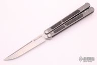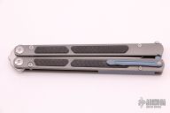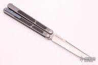 This Balisong by Maxace Knives features a satin finished clip point blade with false top edge. The handle has blasted titanium handles with carbon fiber inlays, anodized titanium backspacers, tip up clip and T-latch. Comes with original box, zippered case with trainer blade and extra hardware. New from maker.