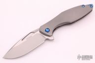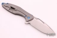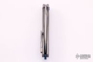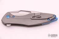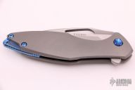 This Arius by Koenig knives features a two-tone blade with thumbhole and flipper. The handle has a nicely milled titanium frame with an anodized tip up clip, blue anodized titanium backspacer. Has ceramic bearings and a ceramic detent ball. Nice detent, lockup and blade seating. Comes with original box and COA dated October 21th, 2021.  Excellent condition.