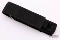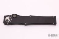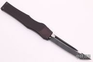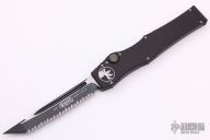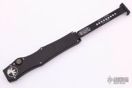 This Halo V by Microtech Knives features a black finished fully serrated blade with fullers. The handle has a black aluminum frame and bead blast finished titanium charging handle. Comes with original nylon sheath. Dated 10/2012 and s/n 03763. Has some light scuffs and scratches, otherwise excellent condition.