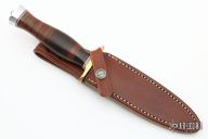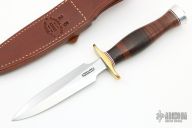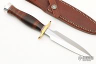 The Model 2-5 by Randall Made Knives is a heavily made dagger or dirk. This knife has a 5" carbon steel satin finished double-edged blade, .159" blade stock and 1.063" blade depth, hidden tang construction. The handle has a brass hilt and duralumin butt, stacked leather grip with red/white/blue spacers. Comes with a brown leather sheath. Excellent condition.