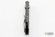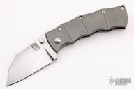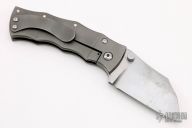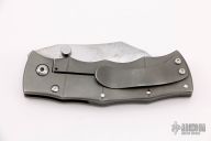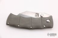 This Bamboo framelock folder by Michael Burch features a hand rub satin finished blade with dual thumbstuds, .18" blade stock. The handle has a titanium frame carved to look like bamboo, G10 backspacer, and a tip up titanium clip. Nice detent, lockup and blade seating. Has some scuffs, scratches, and pitting. Good condition.