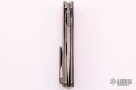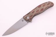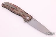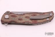 This F3R Flipper from Shirogorov has a tumble finished flat ground spear point Vanax 37 blade with notched flipper. Handle has python canvas micarta scales, tumbled titanium backspacer, tip up clip and liners. Recessed lanyard bail. Dead center blade seating, excellent detent and lockup. Excellent condition. Multi Row Bearing System.