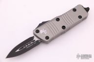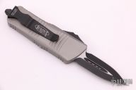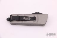 This Troodon Mini OTF automatic by Microtech knives features a black double edged blade, and a "Titanium Gray" aluminum handle with black hardware, tip down stainless steel carry. Glass breaker. S/N 2126. Dated 05/2021. Comes with original box and papers. Excellent condition.
