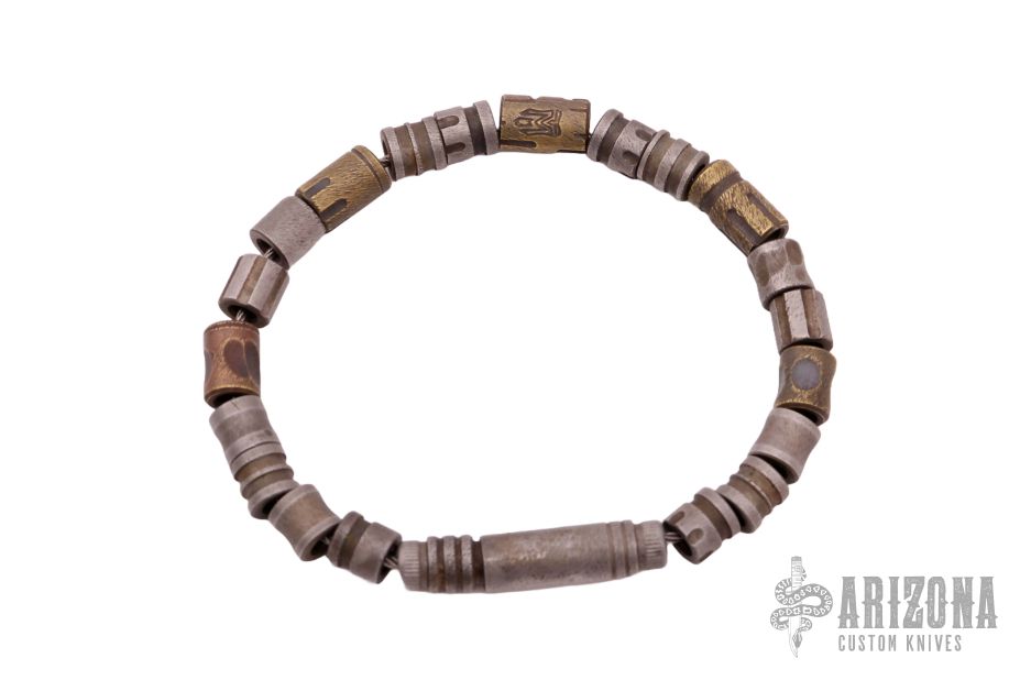 Stainless steel and brass cable bead bracelet by Tim Miller. Has a magnetic clasp. 9" overall. New from maker. At the 2021 NYCKS.