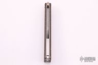 This Basilisk R from HOM Design features a satin finished recurved clip point blade with swedge. The handle is comprised of brown G10 scales over tumbled titanium liners and stainless steel backspacers. Steel and titanium T latch in pommel. Excellent condition. Comes with original box and COA