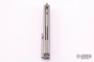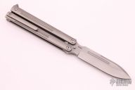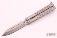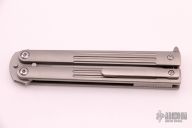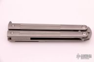 The SPD Invictus Bali-Ti is a utility butterfly knife, featuring titanium billet handles, a Böhler M390 blade, bronze bushing pivot, and a titanium spring latch. Additional details include jimping on the ears and back spacers, and a billet titanium pocket clip. Comes with zippered case. Excellent condition.