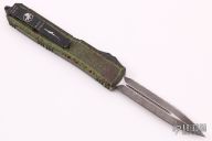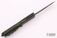 This Ultratech OTF automatic by Microtech features a D/E black blade with one fully serrated edge. Aluminum contoured frame with black hardware and tip down stainless steel clip. Dated 09/2021 and s/n 033. Includes original box and papers. Excellent condition.