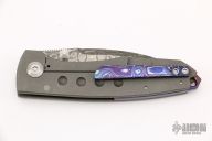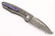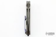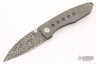 This EDMW framelock folder from Steve Karroll features a Chad Nichols Intrepid Damascus blade, notched thumbrest and dual thumbstuds. The handle has an eggshell finished titanium frame and a Mokuti clip positioned for tip up carry. Nice detent, lockup and blade seating. Blade pivots on bronze washers. Comes with COA dated 12/2/21. New from maker at the KYCKS.