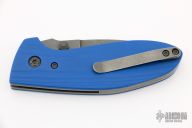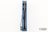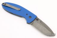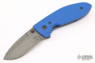 This Alpha framelock by Tom Krein features a stonewash finished drop point blade with dual thumbstuds and a false top edge. The handle has blue G-10 scales, tumbled titanium liners and tip up clip, titanium backspacer. Nice lock up, detent and blade seating. Excellent  condition. Included a padded case and COA.