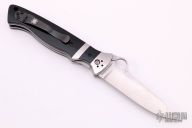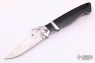 This Vallotton Sub-Hilt by Spyderco features a satin finished blade with a thumbhole, dual thumbstuds, and notched thumbrest. The handle has stainless steel bolsters, black G-10 scales, stainless steel liners, black G-10 backspacer, and 4-way reversible black stainless steel clip. Nice detent, lockup and blade seating. Comes with original box and papers. Excellent condition.