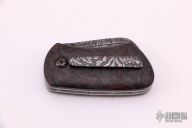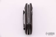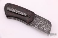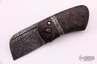 This Minnow by Philip Booth features a cleaver style Damascus blade with fullers. The handle has red/black marbled carbon fiber scales with a Damascus inlay, tip up pocket clip and backspacer, stainless steel liners.  Includes a padded zippered case and COA. New from maker at the 2021 KYCKS.