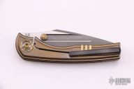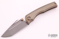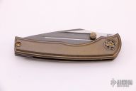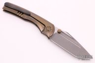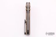 This BBM V2 by Nick Chuprin and Robert Carter features a two-tone blade with acid-wash and satin flats with titanium thumbstuds. The handle has a milled titanium frame with tumbled and anodized finishes (cracked ice), two pice zirconium pivot, zirconium backspacer and tip up clip with hidden screws. Rides on Skiff Made bearings, nice detent, lockup and blade seating. Comes with a zippered case. New from maker.