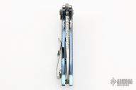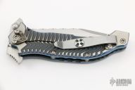 This AXD from the Late Darrel Ralph Designs features a satin finished blade with fileworked spine and dual thumb studs, notched flipper. The handle is comprised of anodized and milled titanium with a stainless steel tip up pocket clip, has Damascus overtravel stop. Opens strong and fast with a spring assisted opening. Has some light scratches, otherwise excellent condition. Includes a padded zippered box.