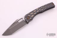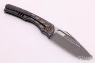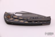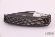 This BBM V2 by Nick Chuprin and Robert Carter features a two-tone acid wash finish blade with satin flats, fullers, thumbhole and milled bevels. The handle has a two tone fractle milled titanium frame, Titanium hardware, and two tone anodized titanium backspacer. Two piece zirconium/titanium pivot and tip up clip with hidden screws. Rides on Skiff Made bearings, nice detent, lockup and blade seating. Comes with a zippered case. New from maker.