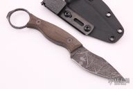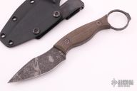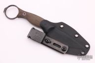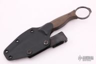 This John Gray Accomplice by Steve Karroll features an acid etched blade with .168" blade stock and 1.138" blade depth, full tang construction with green canvas micarta scales and a 1.125" diameter ring at the butt. Comes with a kydex sheath with Ulti-Clip. Comes with COA. New from maker at the 2021 KYCKS.