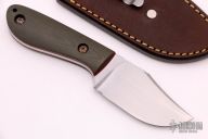 This Land Pirate by Patrick Doyle has a hand rub satin finished blade with false top edge and a notched thumbrest, .151" blade stock and 1.302", full tang construction. The handle has green linen micarta scales, red G-10 liners with lanyard hole, the tang and blade spine have an eggshell texture and the screws are stipple textured and bronzed. Knife comes with a brown leather sheath with pocket clip made by Treeman Leather Shop. Comes with original box. New from maker at the 2021 KYCKS.