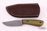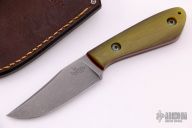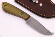 This Free Booter by Patrick Doyle has an acid tumble finished K-110 Steel blade with false top edge, .126" blade stock and .942", full tang construction. The handle has translucent yellow G-10 scales, brown canvas micarta liners with lanyard hole, the tang and blade spine have an eggshell texture and the screws are stipple textured and bronzed. Knife comes with a brown leather sheath with pocket clip made by Treeman Leather Shop. Comes with original box. New from maker at the 2021 KYCKS.