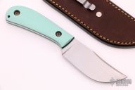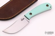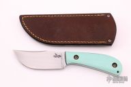 This Persian Pirate by Patrick Doyle has a hand rub satin finished K-110 Steel blade with false top edge, .127" blade stock and 1.181", full tang construction. The handle has Tiffany Blue G-10 scales, black and teal G-10 liners with lanyard hole, the tang and blade spine have an eggshell texture and the screws are stipple textured and bronzed. Knife comes with a brown leather sheath with pocket clip made by Treeman Leather Shop. Comes with original box. New from maker at the 2021 KYCKS.
