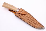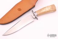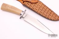 This Bowie by Master Smith Tad D Lynch features a hand rub satin finished blade with visible temper line and false top edge, .217" blade stock and 1.589" blade depth, hidden tang construction. The handle has a stainless steel guard and collar with a fossil walrus ivory grip. Comes with a brown leather sheath with crocodile skin overlay by Paul Long. Excellent condition. This knife is wearing his Journeyman Smith stamp.